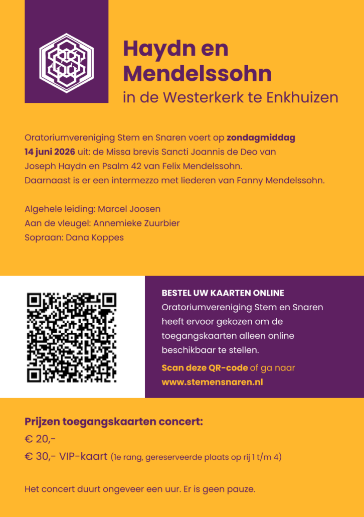 Zondagmiddag 14 juni 2026 voert Oratoriumvereniging Stem en Snaren Psalm 42 “Wie der Hirsch schreit” van Felix Mendelssohn en de Missa brevis Sancti Joannis de Deo van Joseph Haydn uit in de Westerkerk te Enkhuizen.